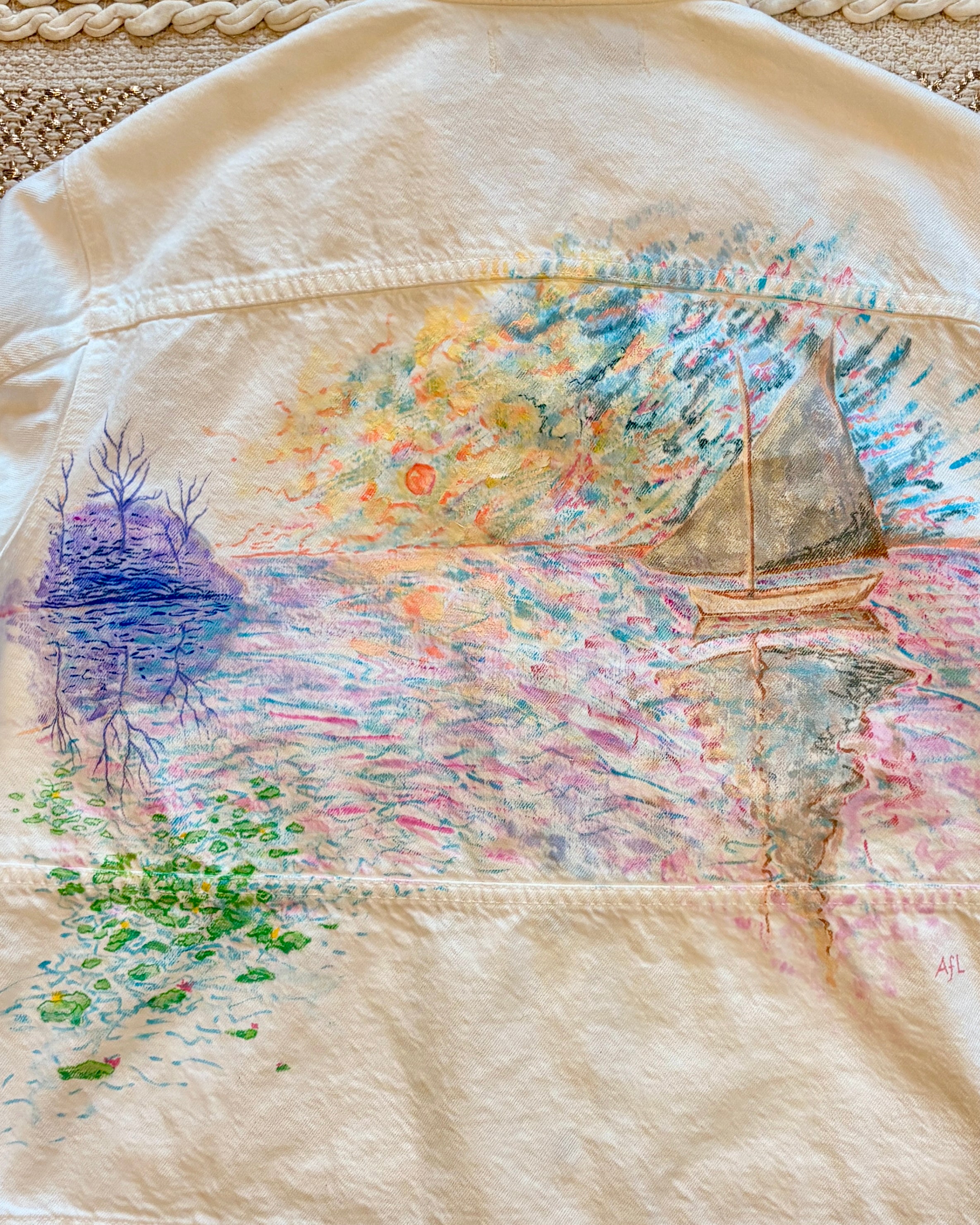 Hand-painted, custom denim jacket. Inspired by Monet's lily pads and oceanic sunsets. Vintage Trave. Born in Atlanta, made in Maine.