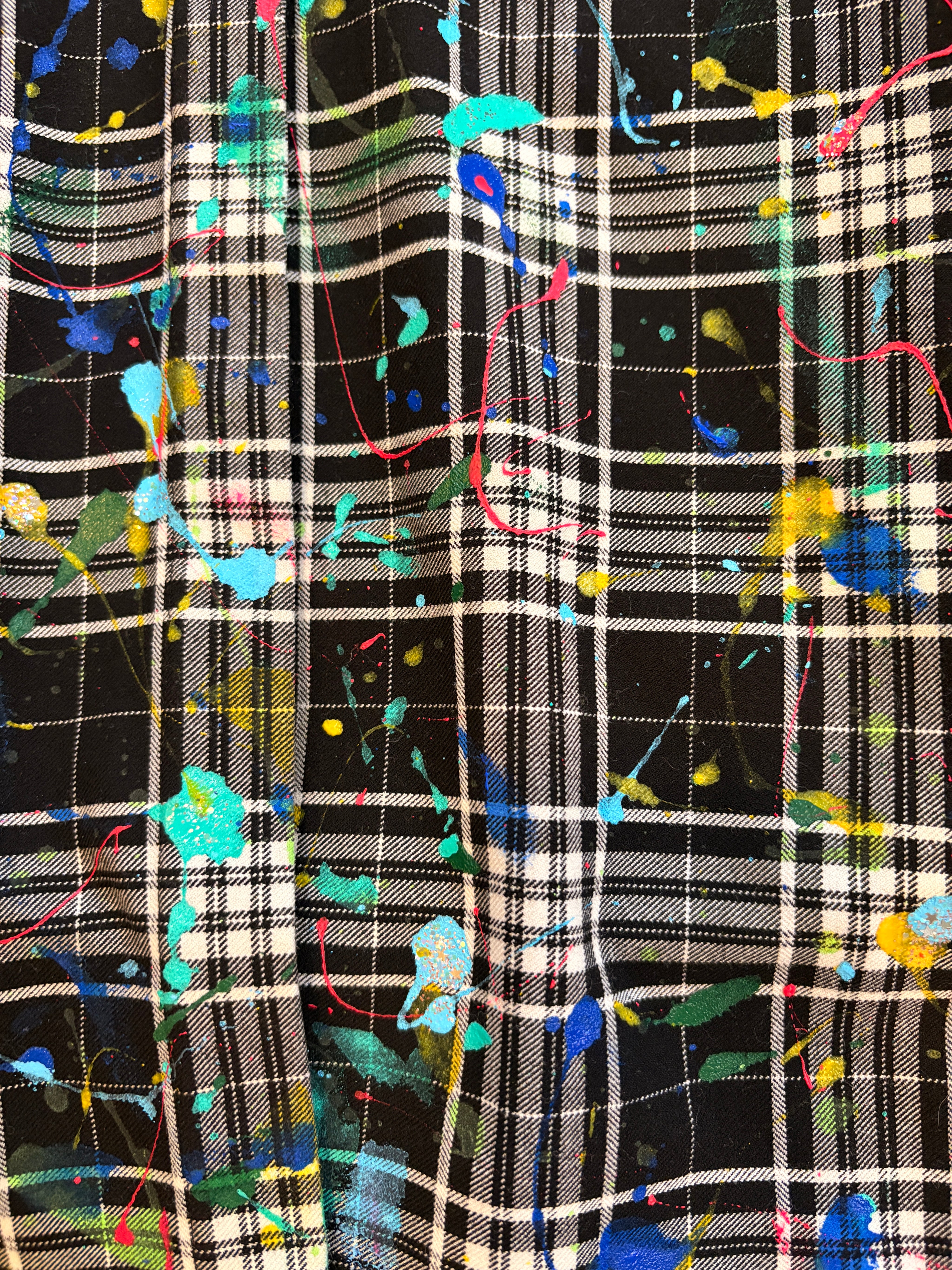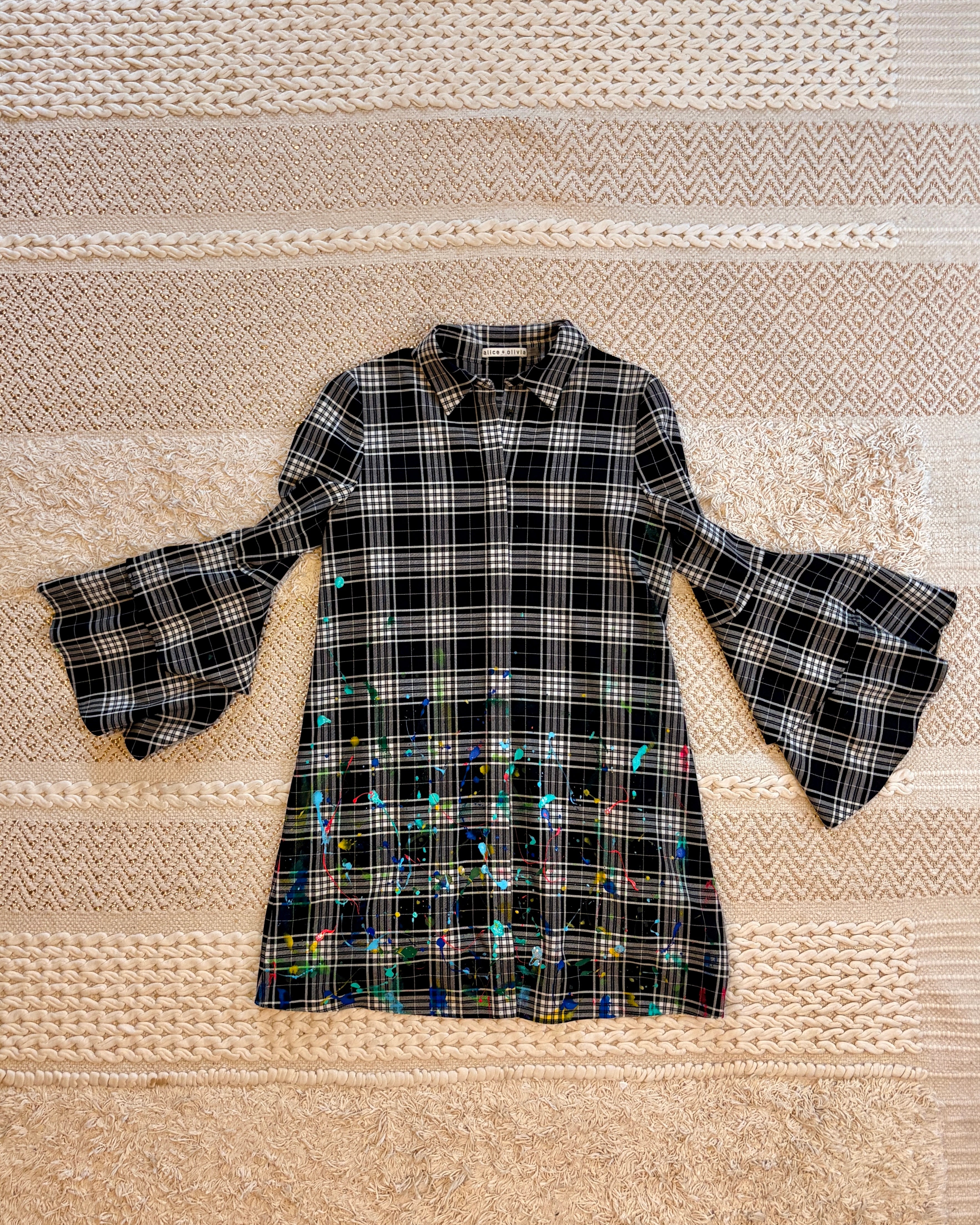 Vintage Alice & Olivia flannel dress. Hand-splattered with turquoise, royal blue, yellow, lime green, and hot pink. Born in Colorado.