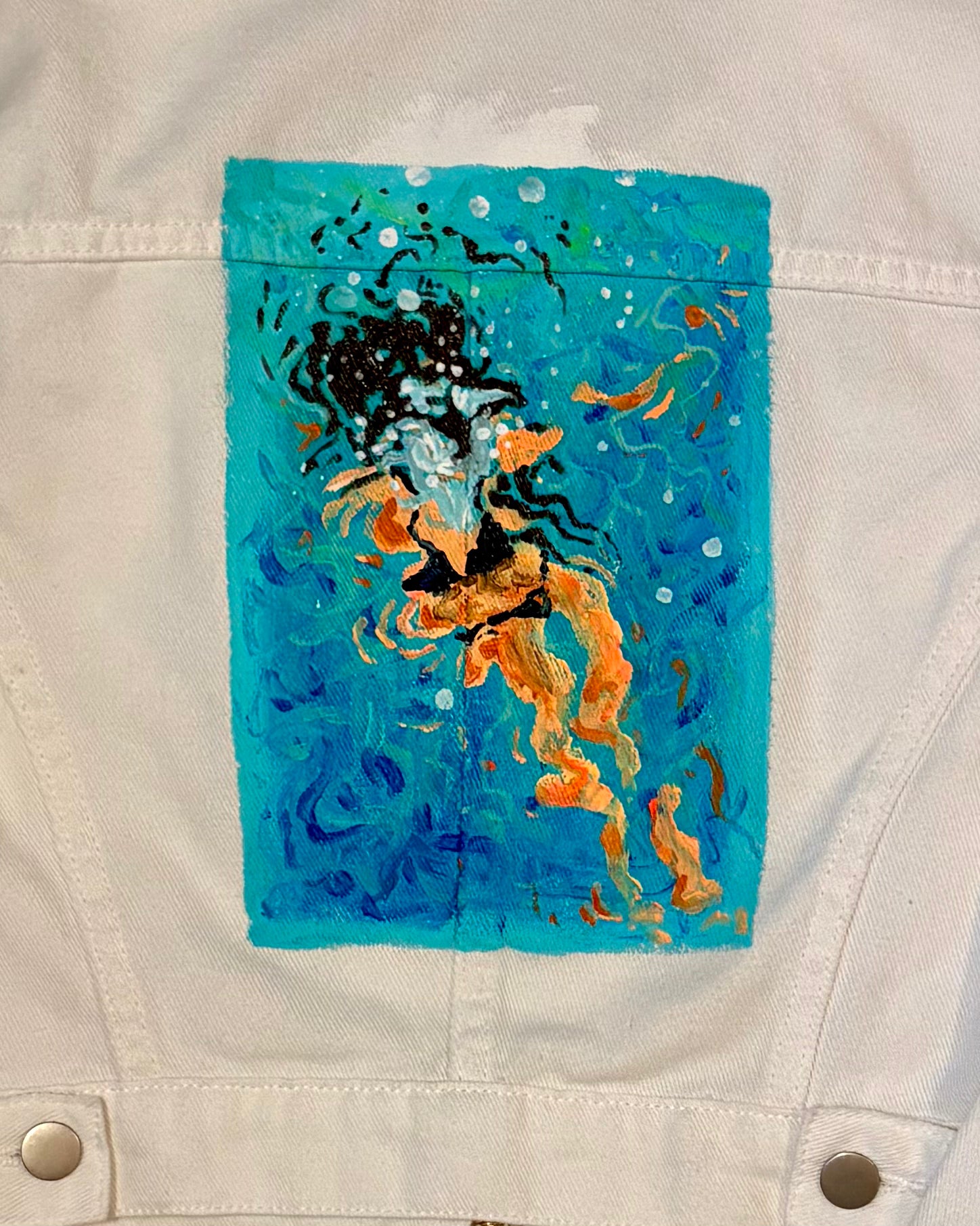 Hand-painted, white denim jacket using acrylic paint. Images are drawn from my original paintings. Each jacket is painted per order.