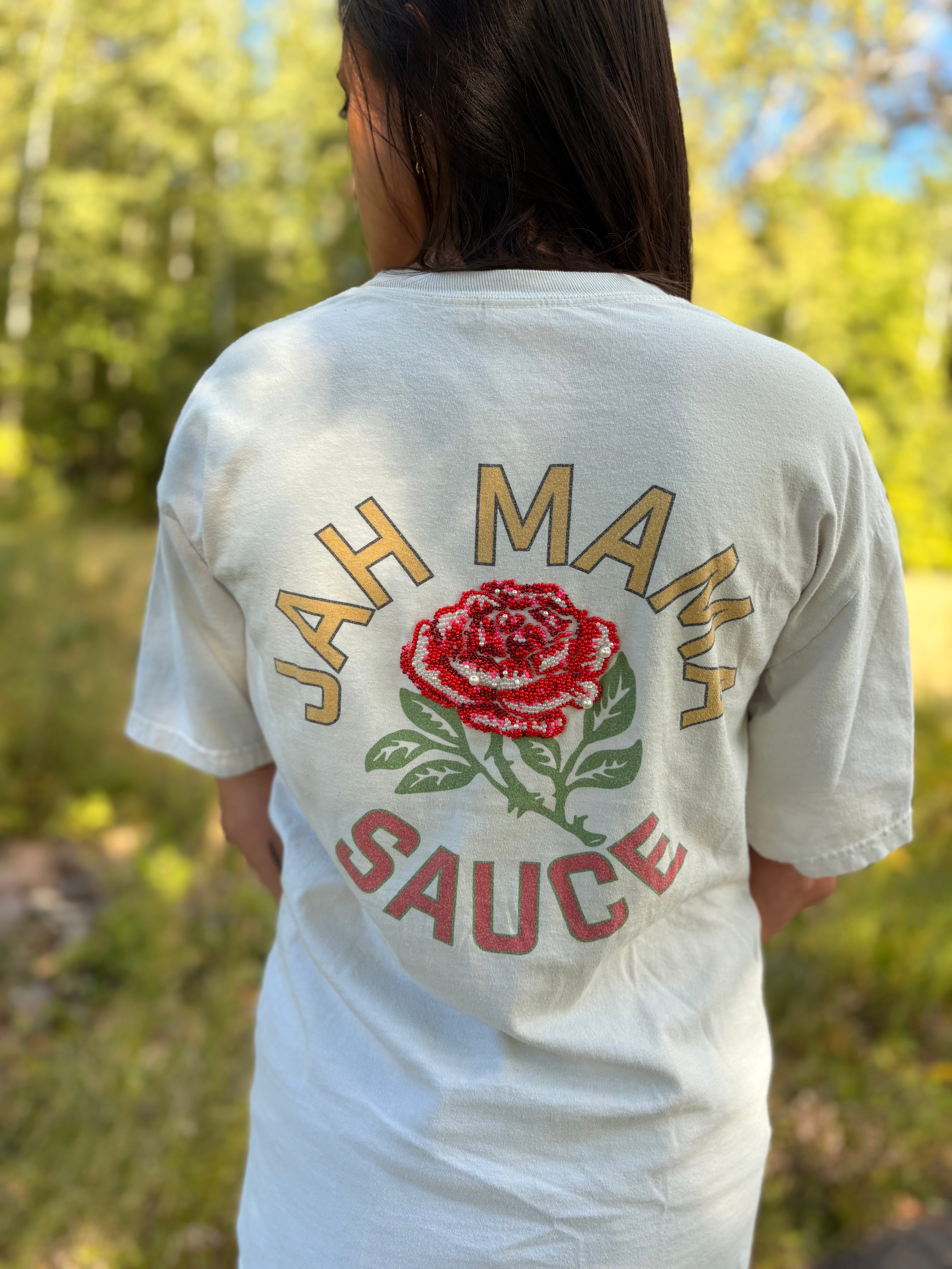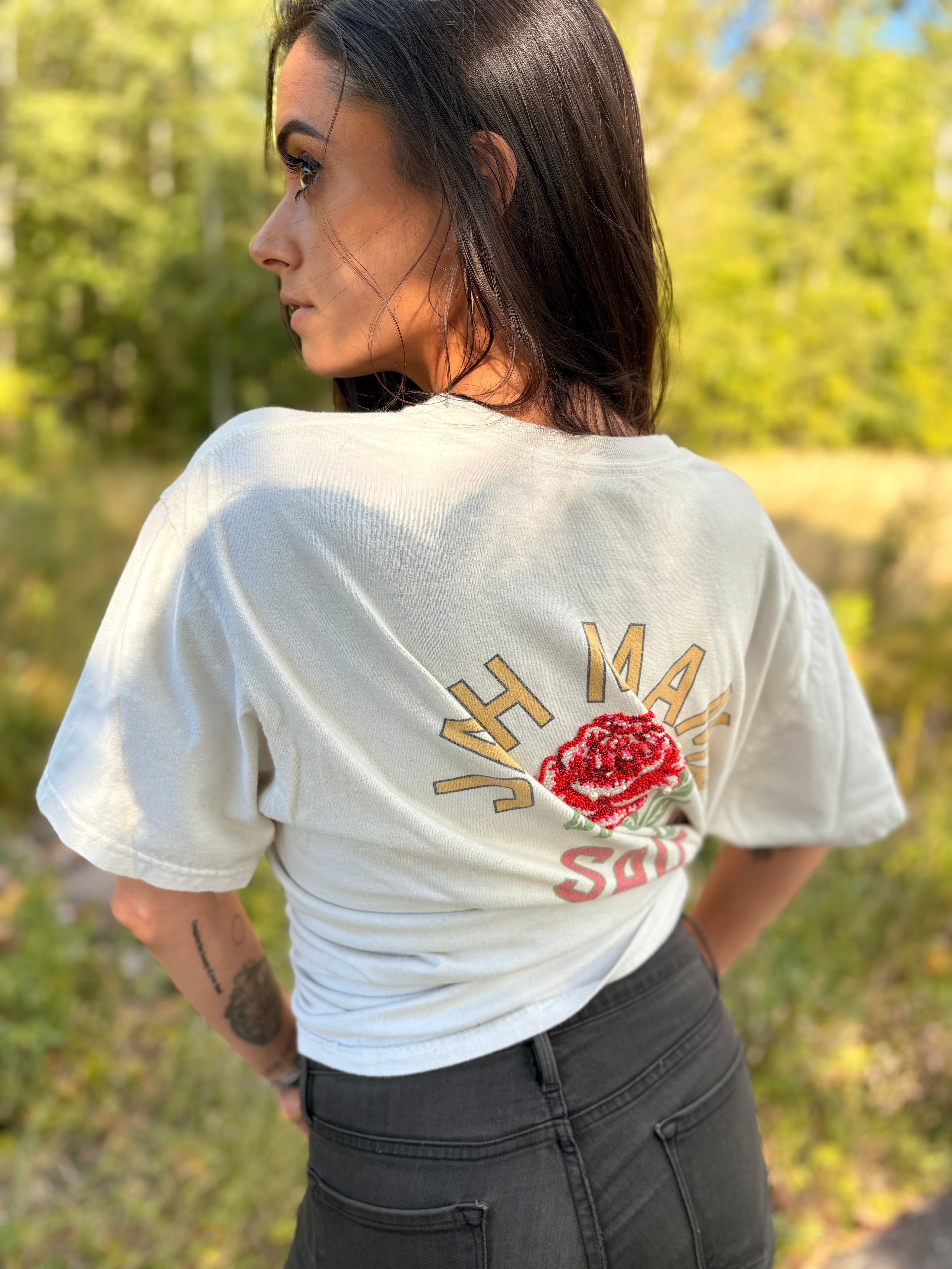Vintage T-shirt. Found in Big Sur, CA. Hand-beaded rose on the back & painted logo on the front.