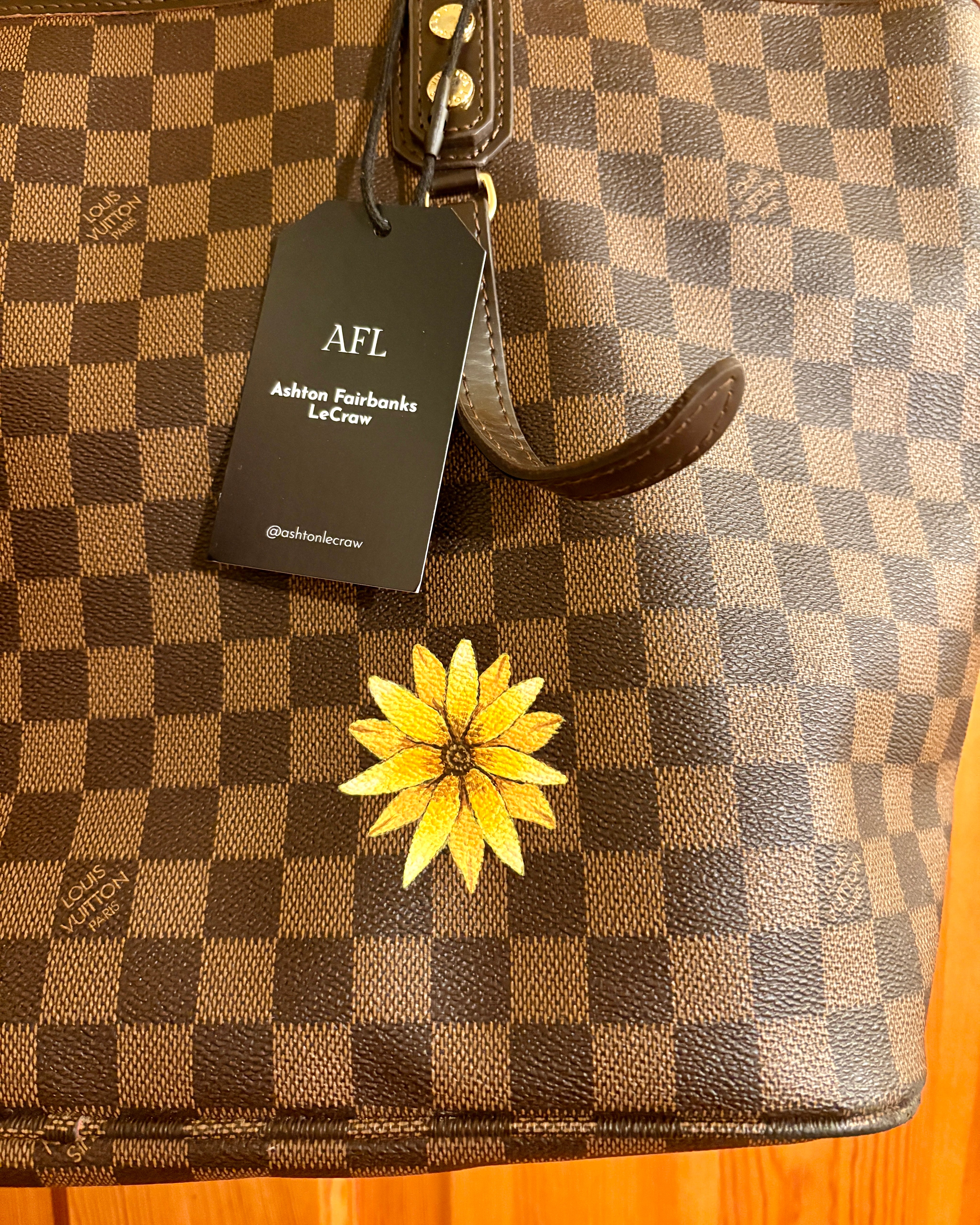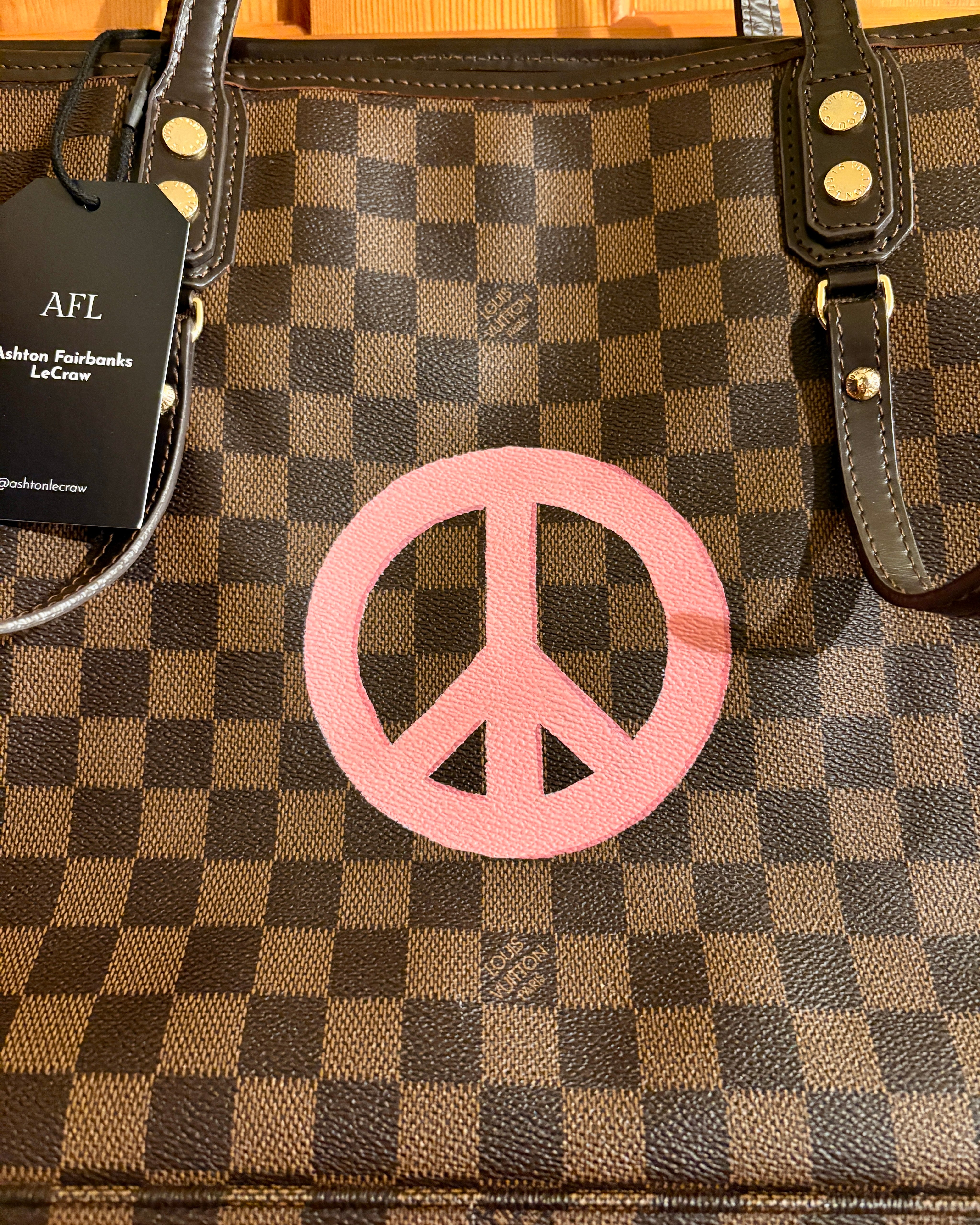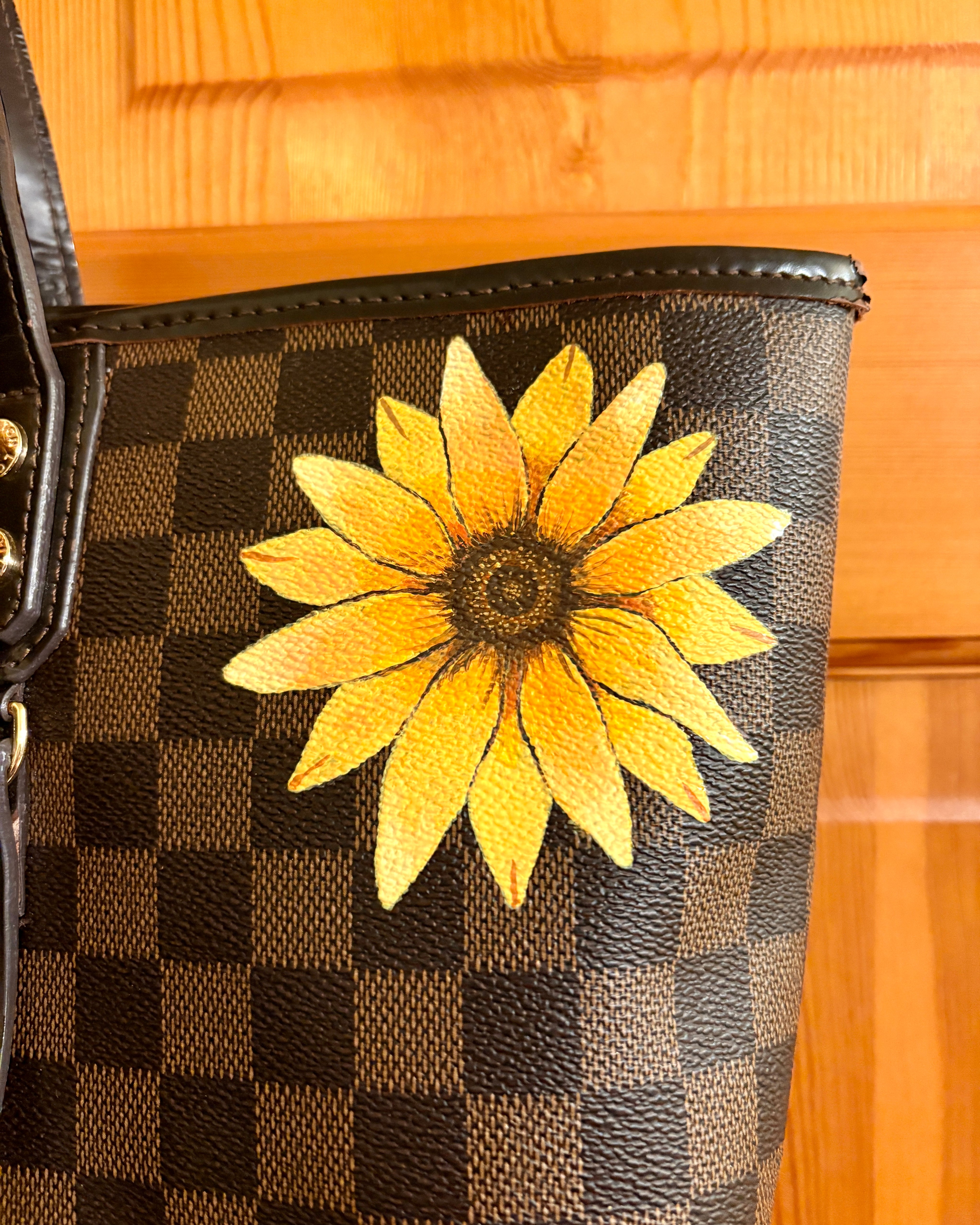 Custom painted Louis Vuitton bag with pink peace sign & sunflowers. Send yours in for me to paint your heart's desire and make your lux bag even that more special.