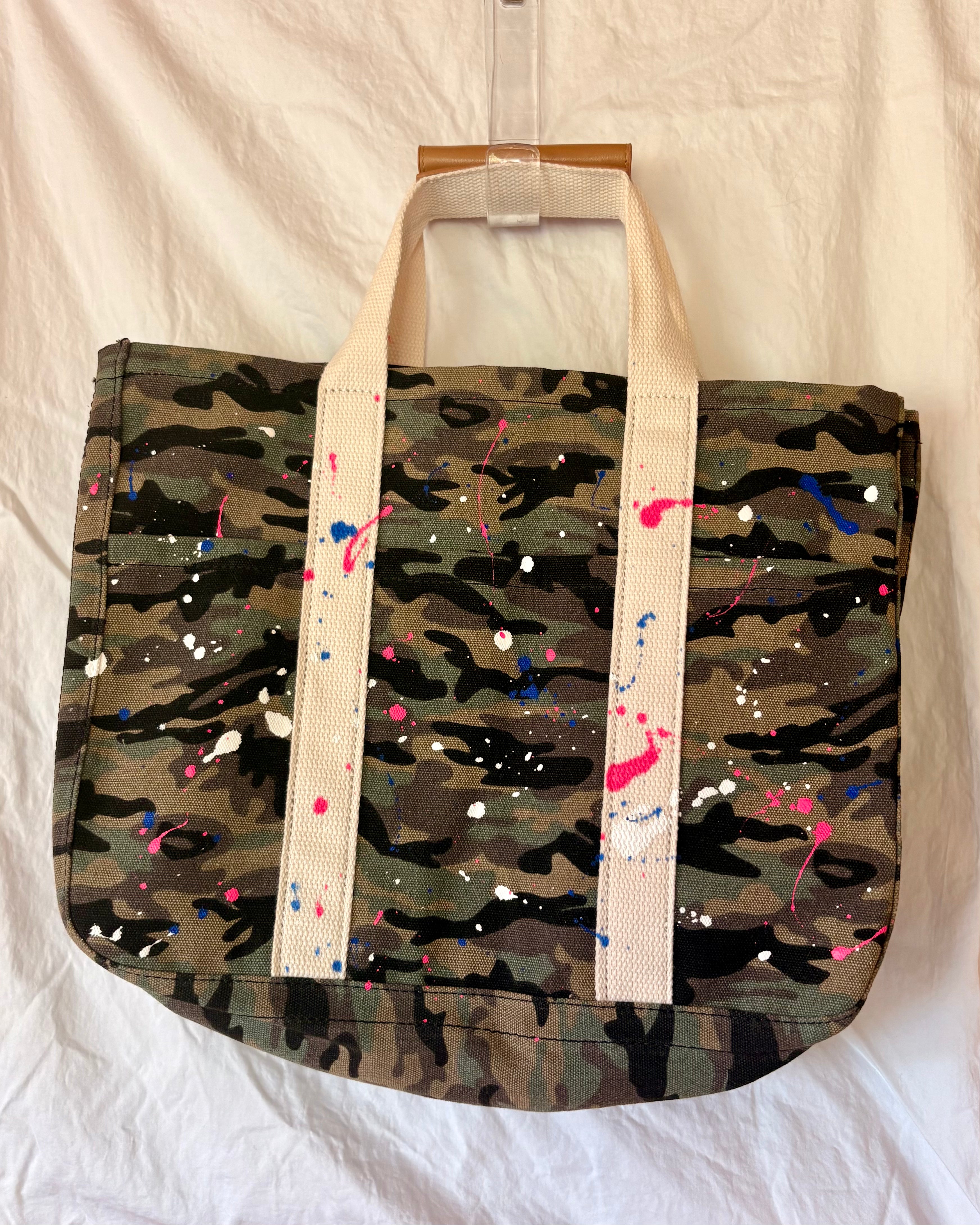 Hand-painted, canvas, camo tote with storage sections inside.