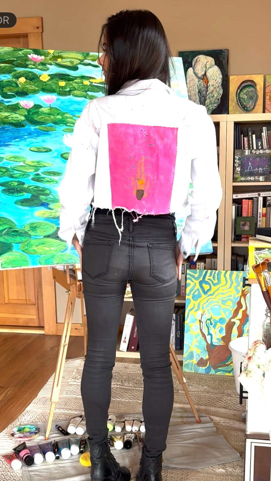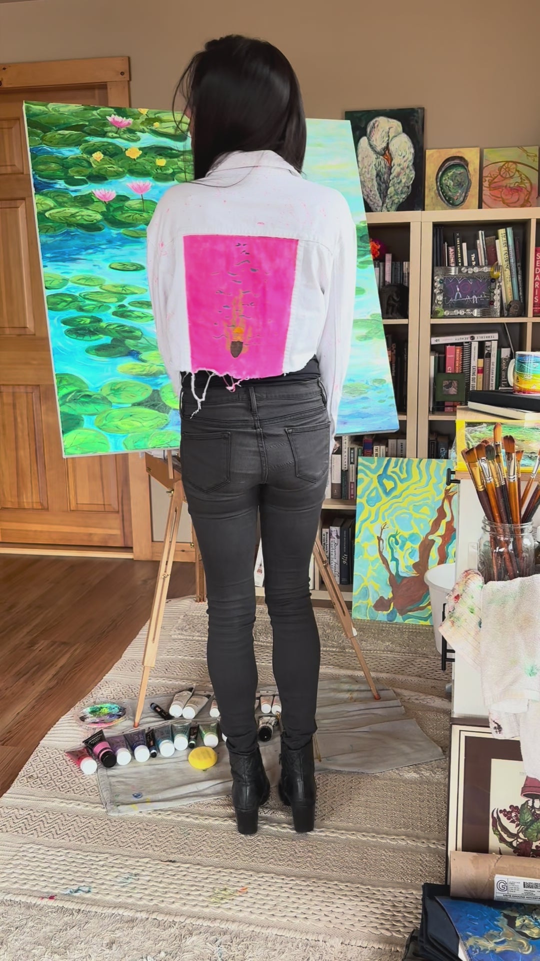 Hand-painted distressed, white denim jacket inspired by a trip to Antigua with one of my best friends, Nerma. Custom pieces available upon request.