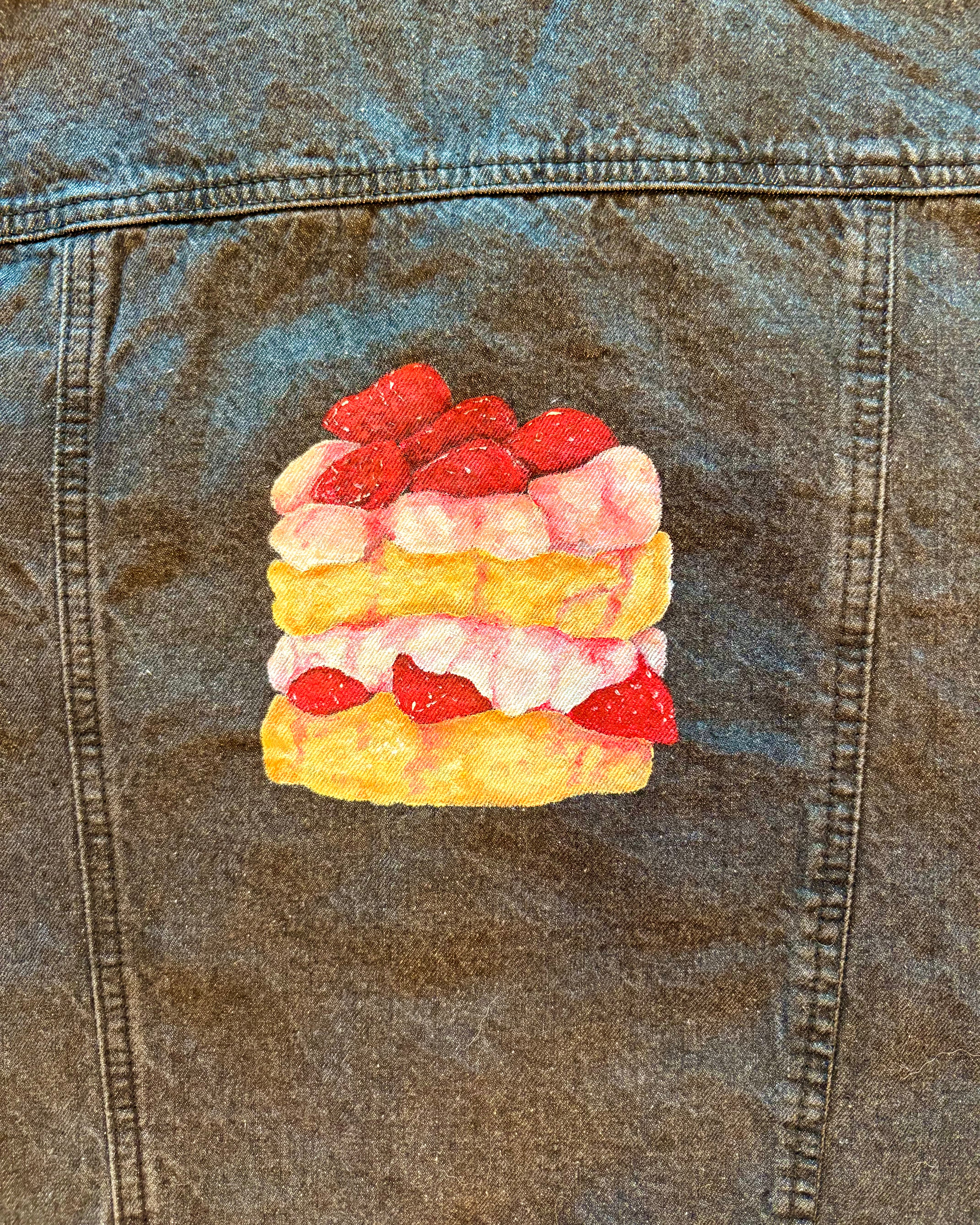 Black wash denim jacket with your favorite southern dessert hand-painted on the back. Who doesn't like strawberry shortcake? Born in Maine.