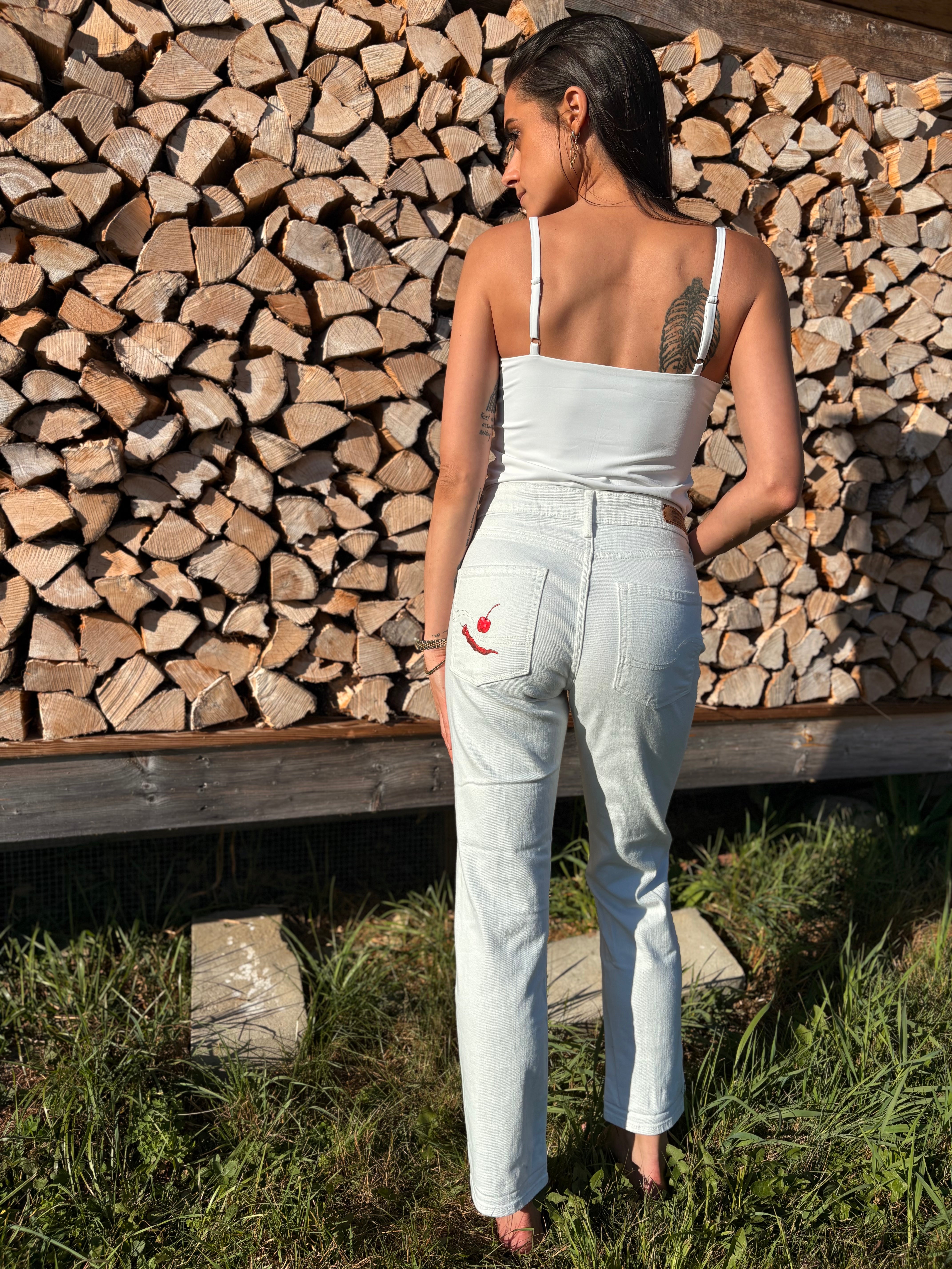 . Chili pepper & maraschino cherries painted on back left pocket and right side seam.