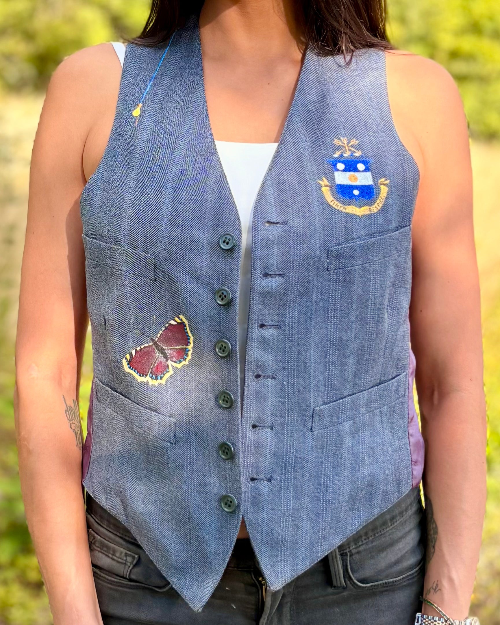 Vintage cotton linen vest with silk back. Hand-painted Fairbanks crest, mourning cloak butterfly, and lightbulb. Found in Maine. Custom work available.