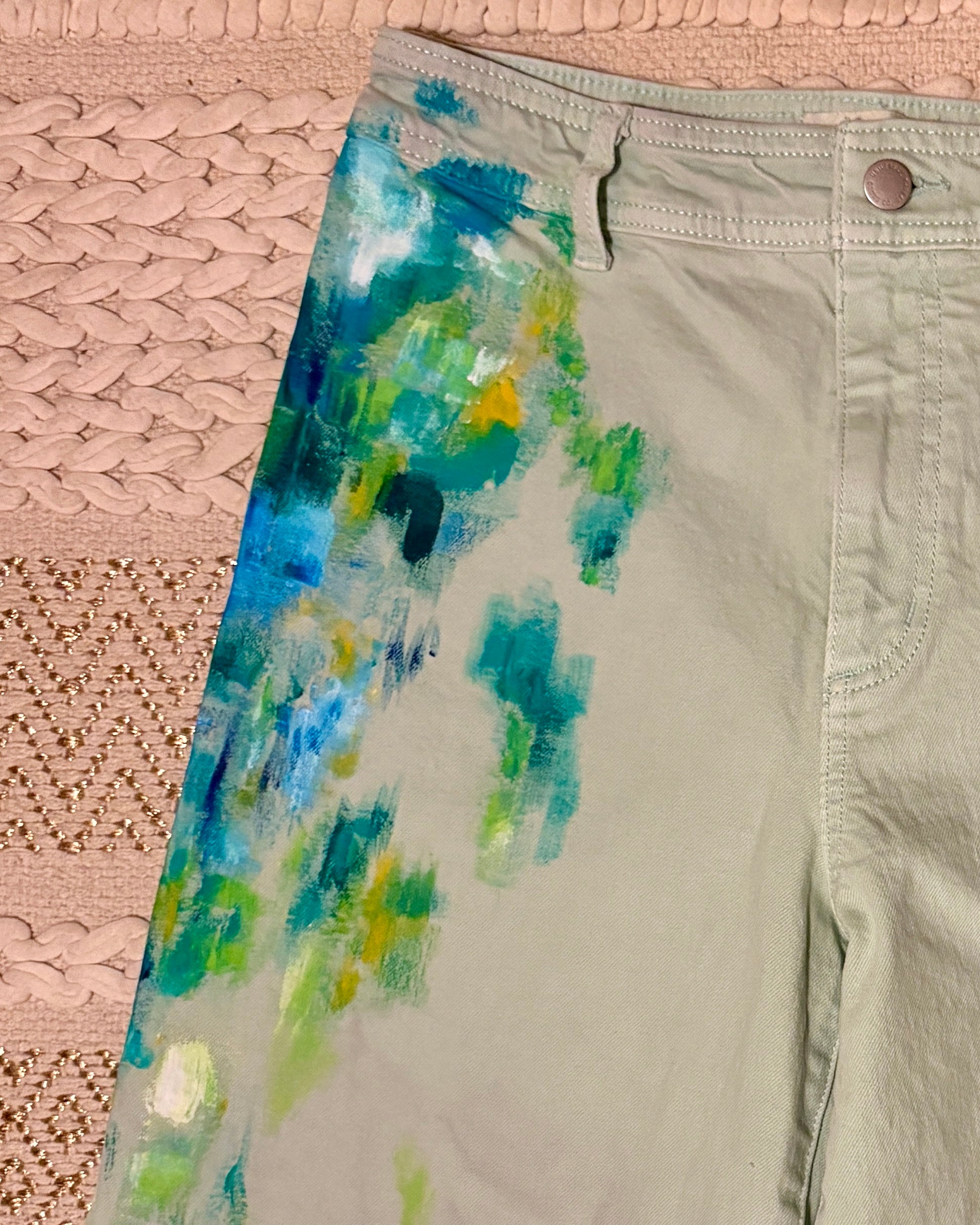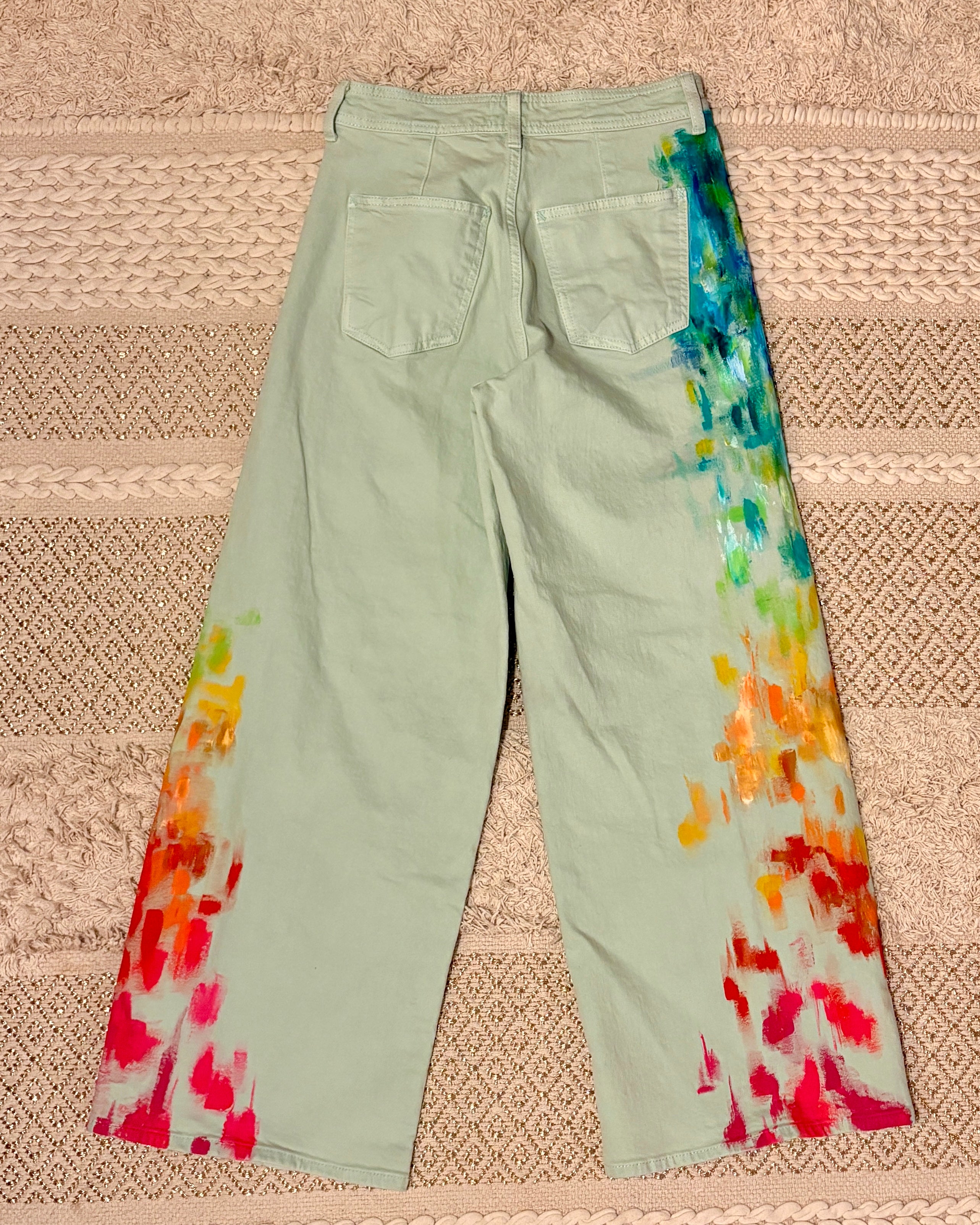 Seafoam, vintage denim, hand-painted with vibrant love. High-waisted, wide leg. Runs small. Born in Texas.