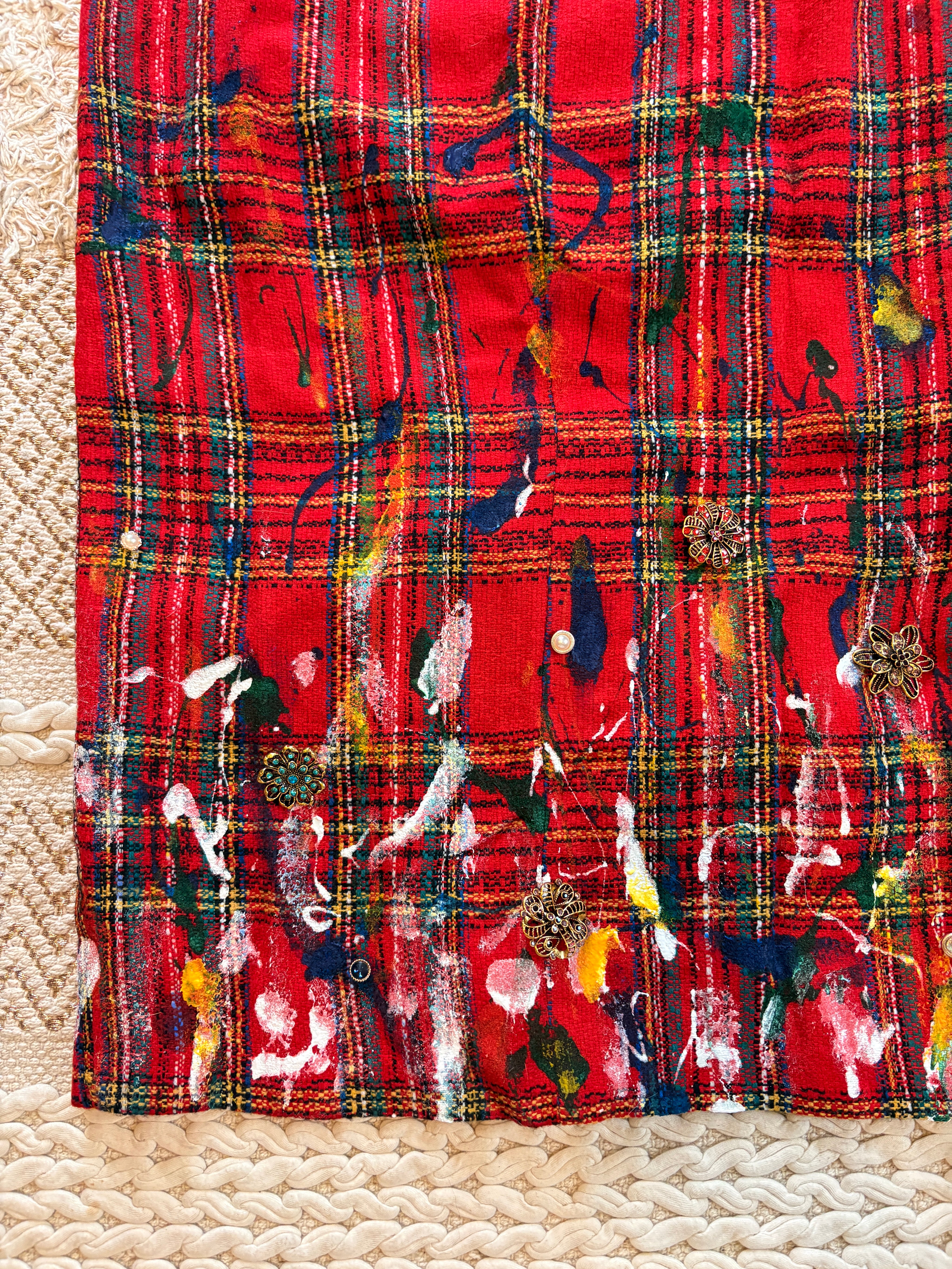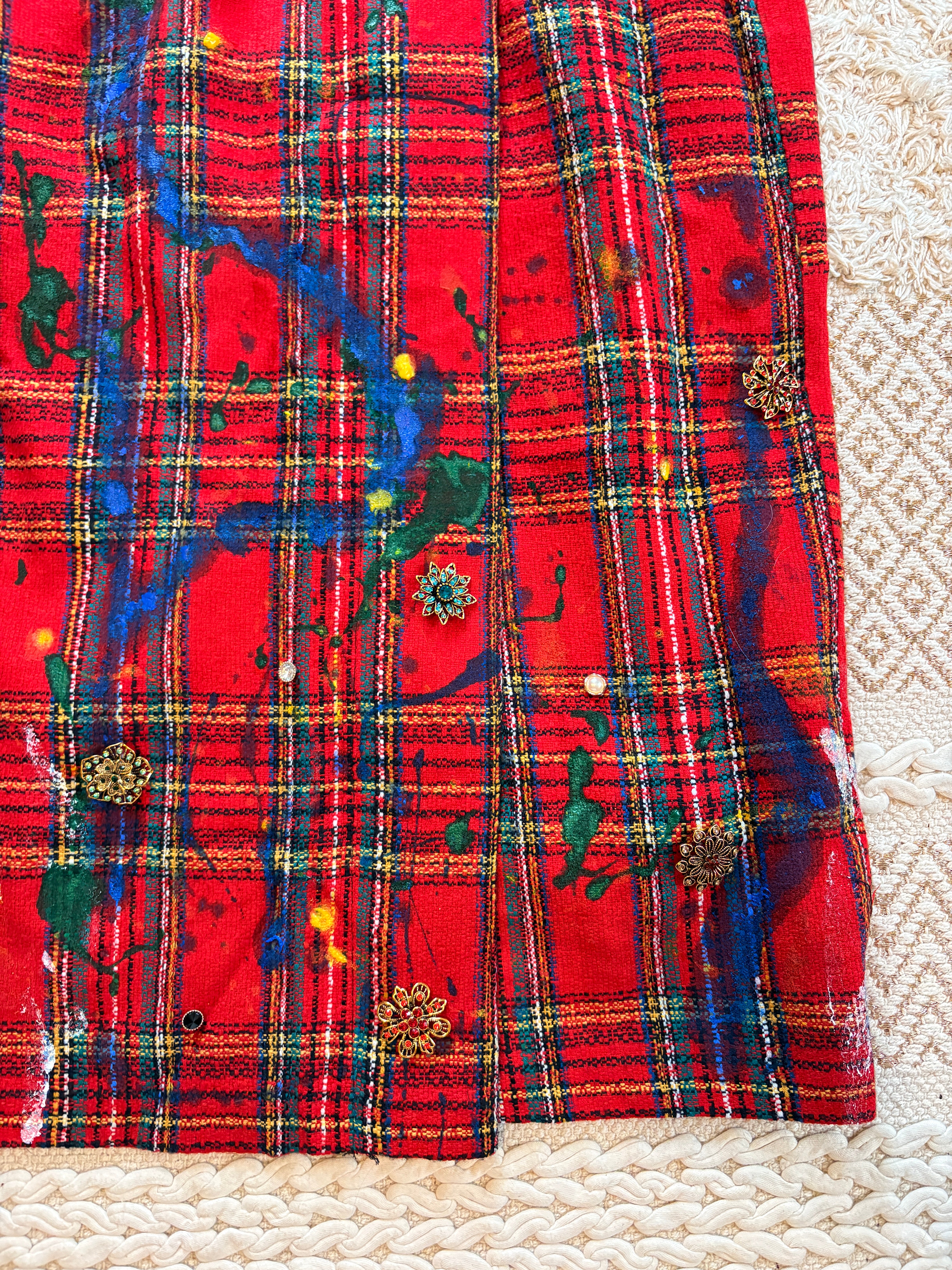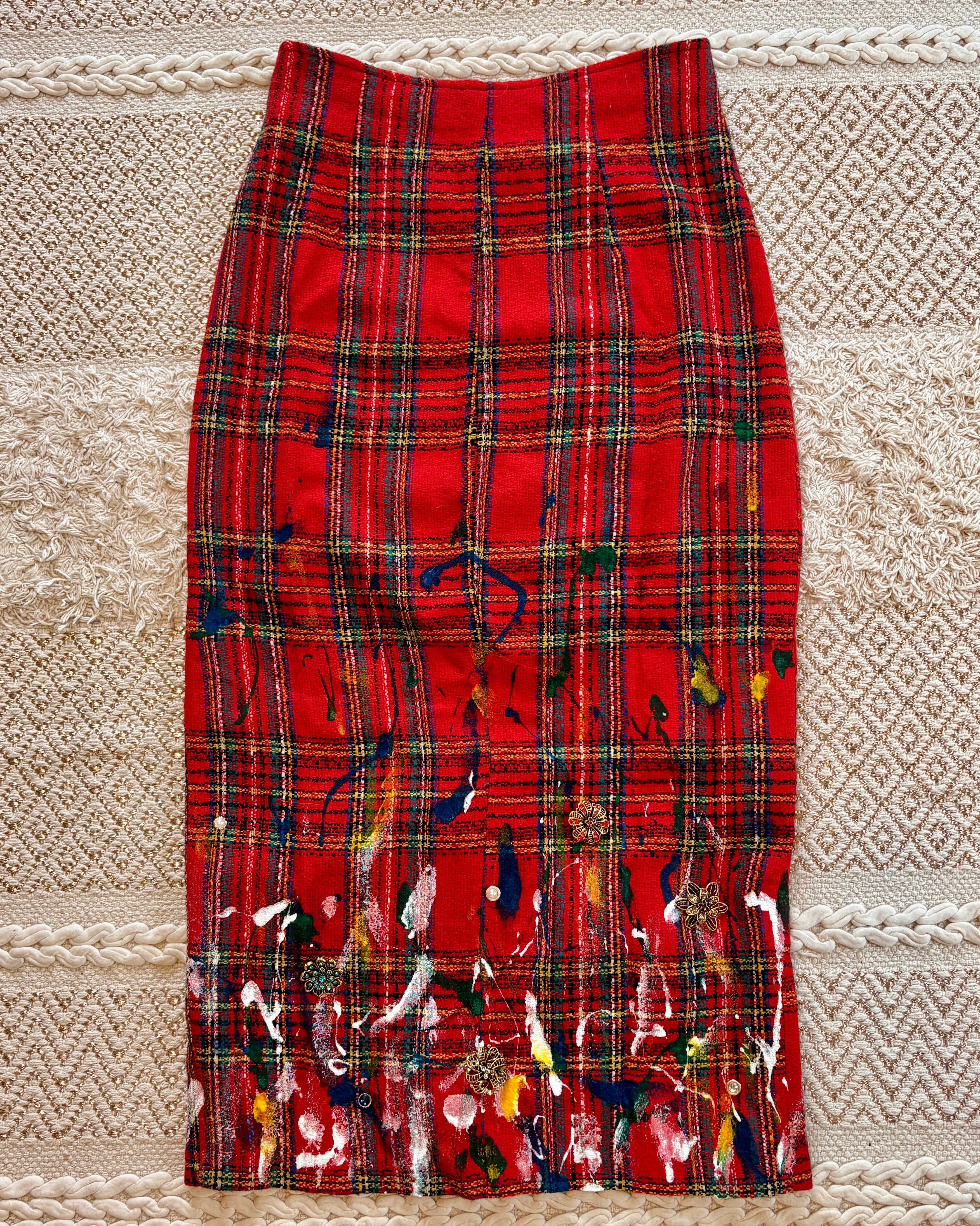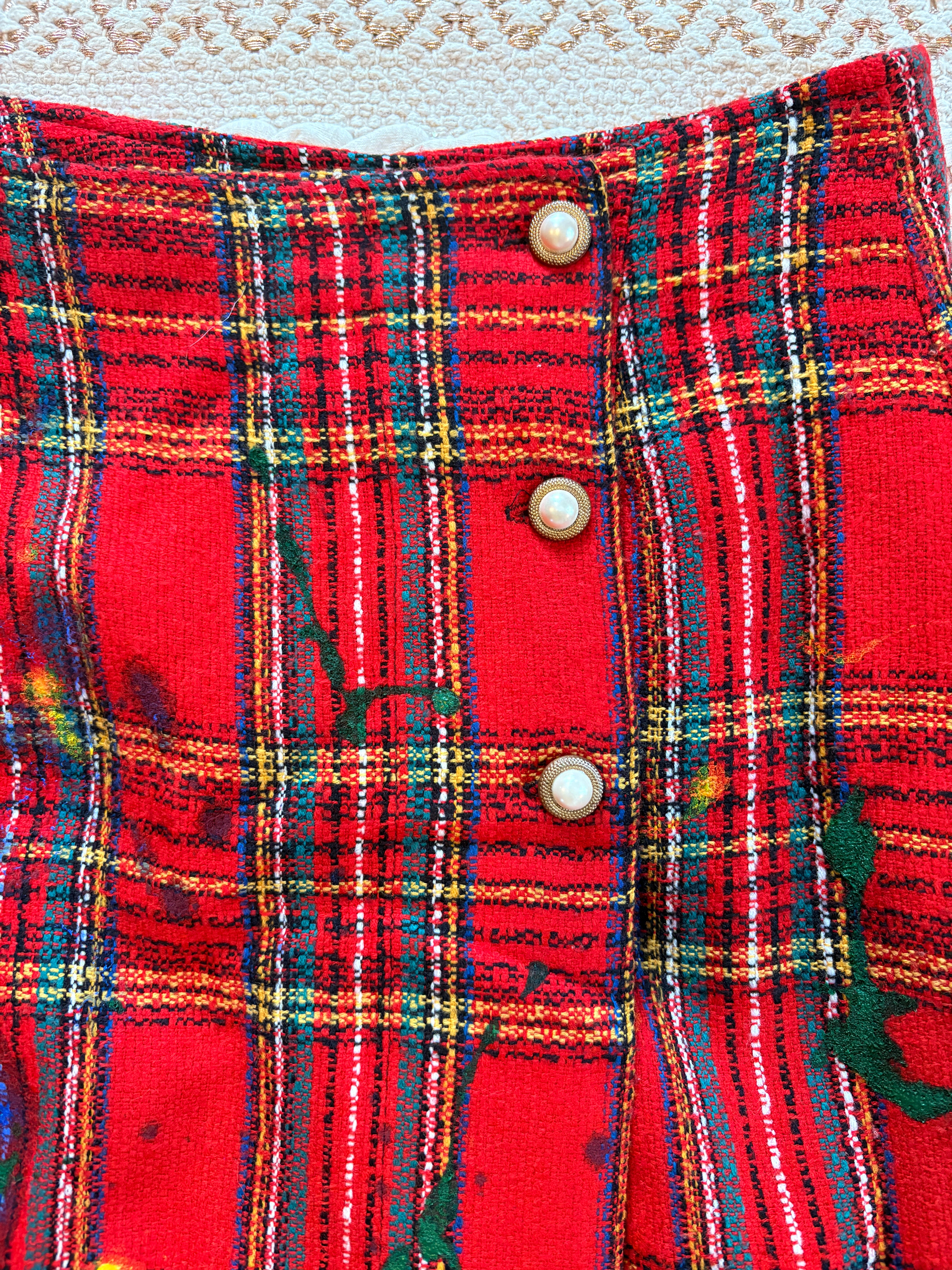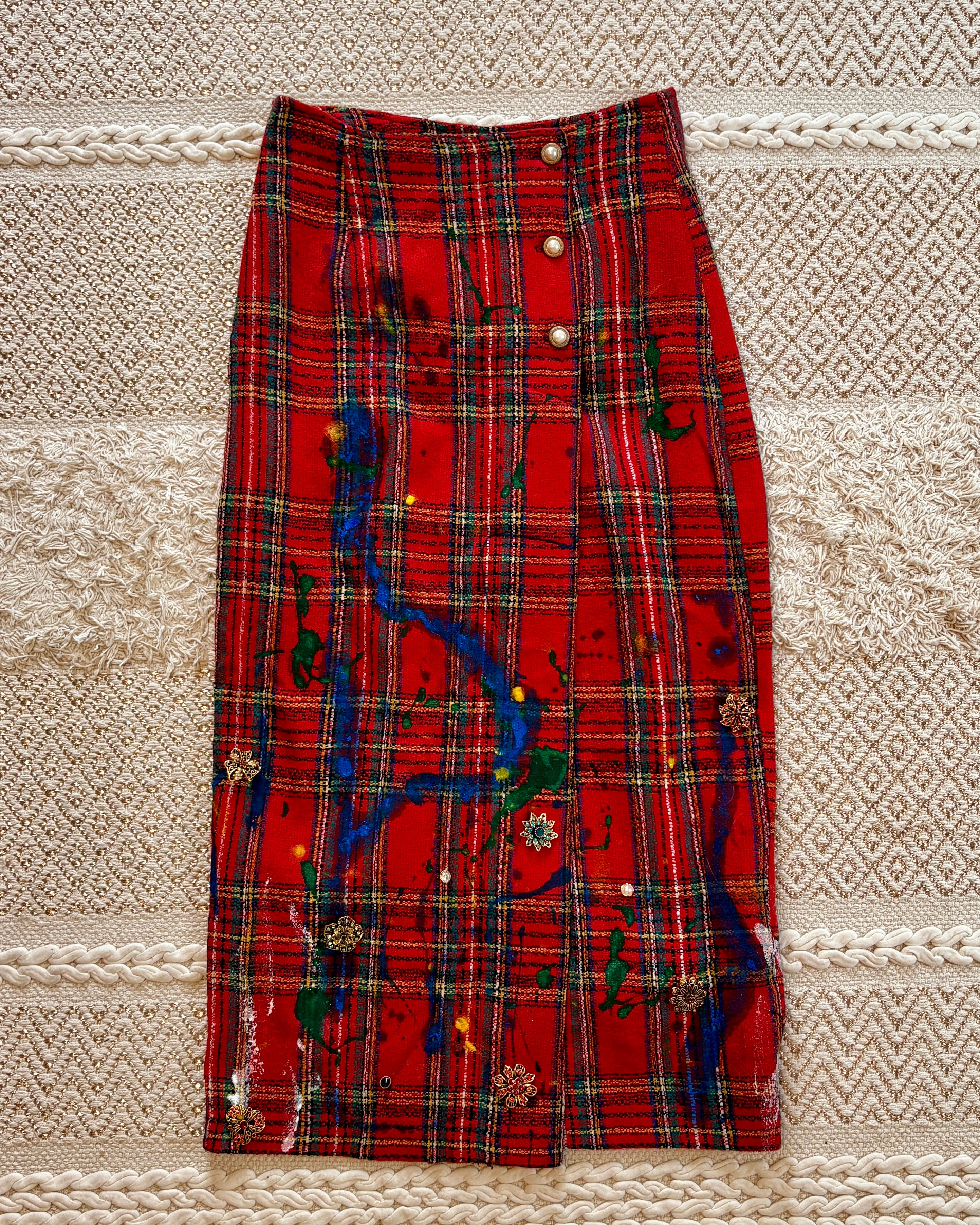 Vintage, 90's era, woven tartan pencil skirt with pearl buttons. Tag says 7 but it fits high-waisted like a 27/28. Born in NYC.